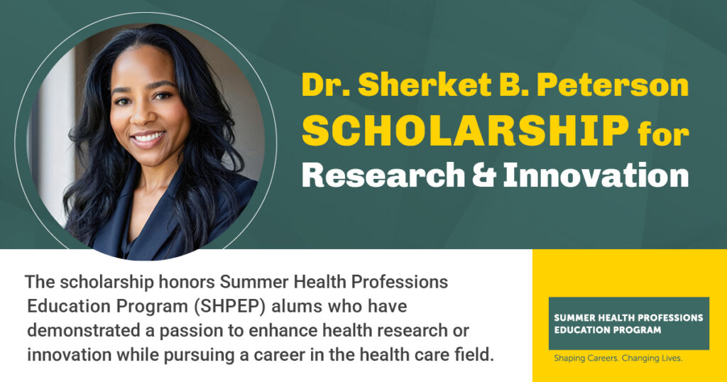 Sherket B. Peterson, PhD, a Minority Medical Education Program (MMEP) alum, is excited to offer a scholarship opportunity to Summer Health Professions Education Program (SHPEP), Summer Medical and Dental Education Program (SMDEP), Summer Medical Education Program (SMEP), and MMEP alums! With the support of the ADEAGies Foundation and the Summer Health Professions Education Program, the Dr. Sherket B. Peterson Scholarship provides financial support in the form of a $3000 scholarship and mentorship to further the education of students in health-related careers. The scholarship honors program alums interested in pursuing a career in a field that will enhance health research or innovation with the potential to impact the world!