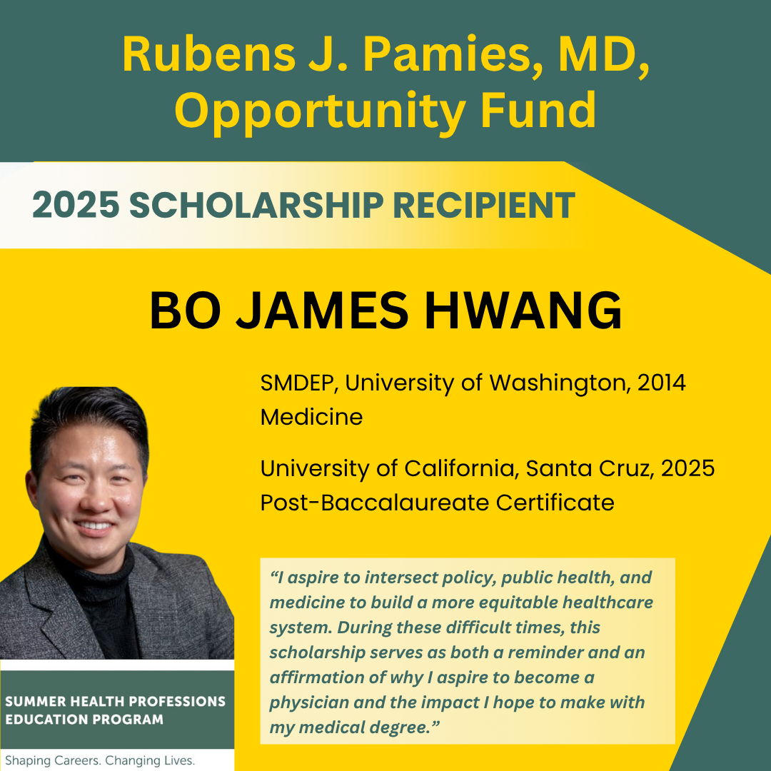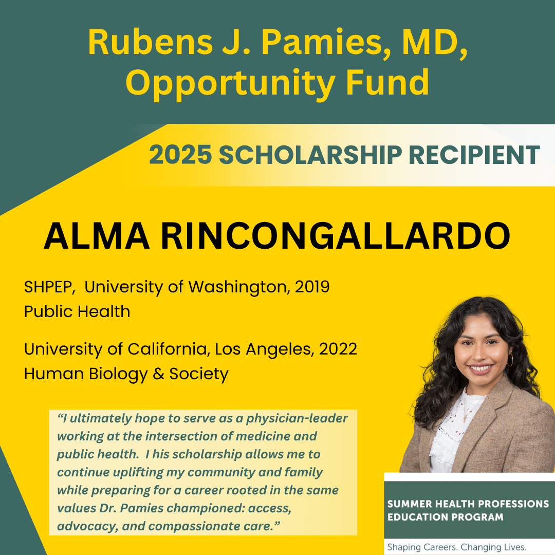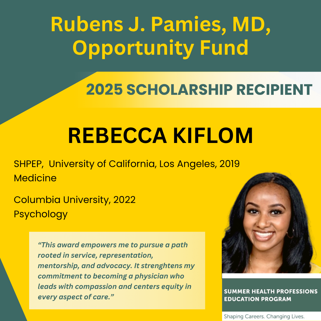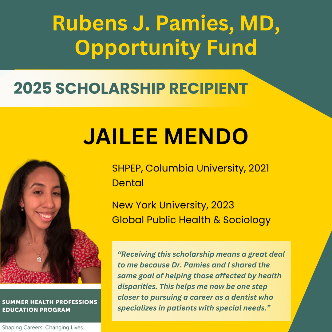 The Rubens J. Pamies, MD, Opportunity Fund was established in 2010 by the SHPEP National Alumni Advisory Board to provide financial assistance to program alums applying to professional or graduate degree programs for careers in a health profession*.